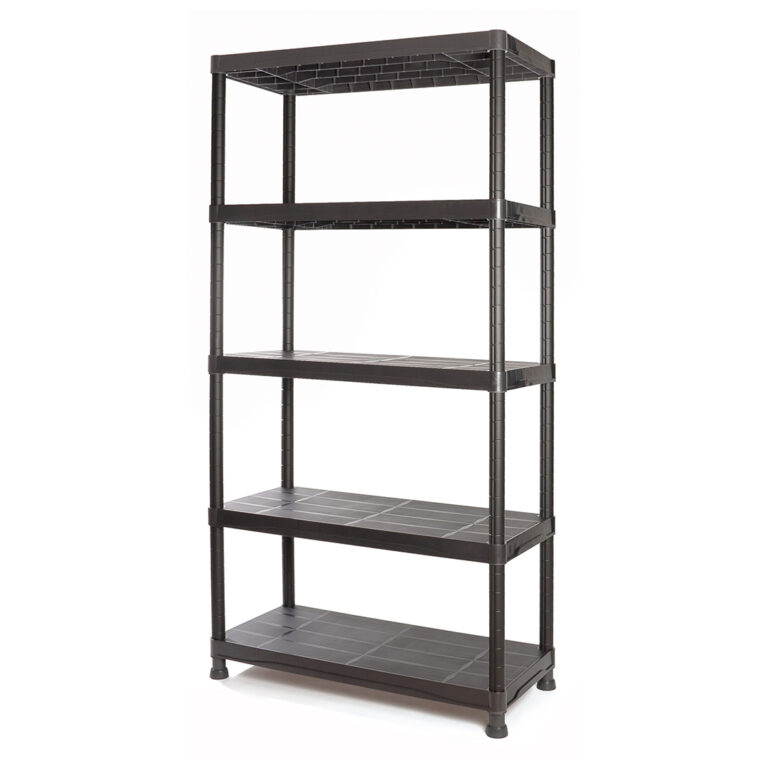 Plastic shelving kit mod.9 Measurements 900 x 400 x 1800 mm Contains: 5 Bandejas / 16 Puntales / 20 Casquillos reguladores / 6 Tapones / 6 Pies / 3 Soportes estanería Material : PP Resin – Made in Spain