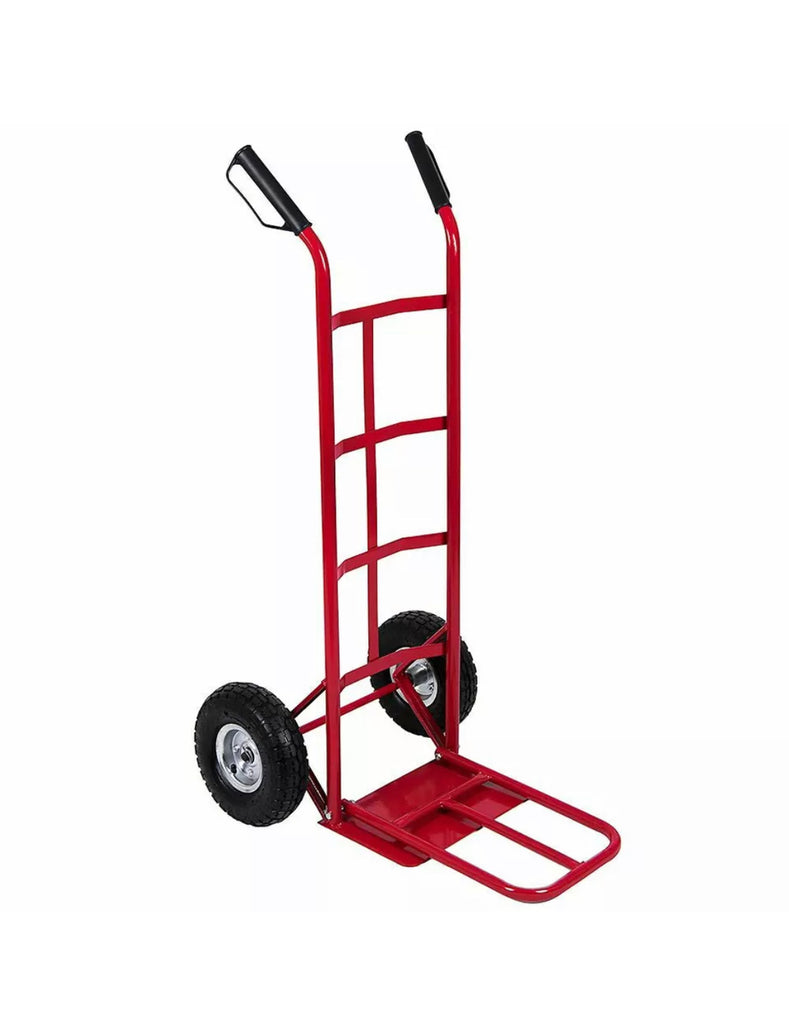 HEAVY DUTY MULTI PURPOSE SACK TRUCK STURDY STEEL TUBULAR CONSTRUCTION RED PAINT FINISH PNEUMATIC 10 INCHES DIAMETER TYRES AND WHEEL GUARDS HIGH LOOP DESIGN MAXIMUM LOAD 200 KG H 51 INCHES W 22 INCHES D 19 INCHES MODEL ST200