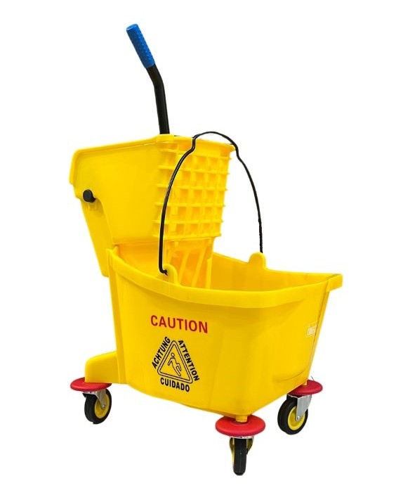 COMBO BUCKET & WRINGER MOPPING UNIT; ALL PLASTIC COMBO MOPPING UNIT, 20 LITRE BUCKET WITH STEEL HANDLE WITH 75MM (3″) CASTORS AND SIDE PRESS PLASTIC WRINGER HAS TOP AND BOTTOM SQUEEZE ACTION. SUITABLE FOR 12 TO 16 OZ KENTUCKY MOPS. COLOR: YELLOW.